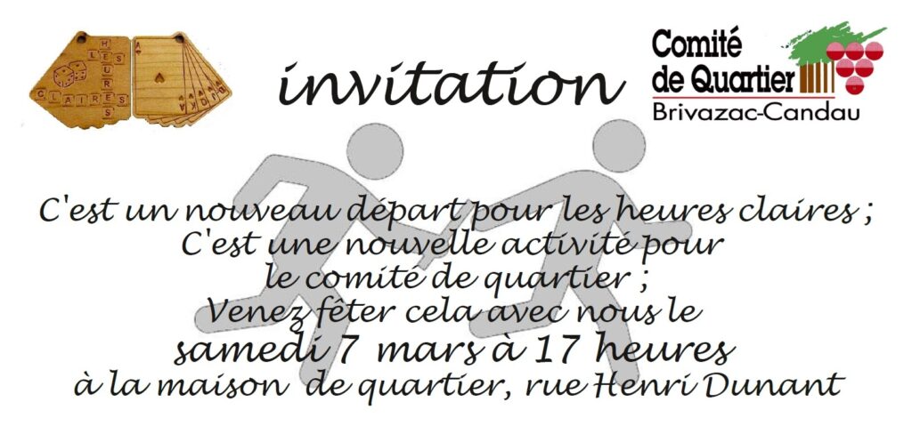 Les Heures Claires rejoignent le comité de quartier. Cette association bien connue du quartier réunit deux fois par semaine les personnes âgées (et pas seulement) désireuses de se retrouver pour des moments de convivialité, échanges, jeux de société et autres activités de détente. Le départ de son président Yvon Bouyer et l’absence de successeur compromettait l’avenir de cette association appréciée de tous ses membres. Le comité de quartier, conscient de l’importance et de l’investissement offert depuis de nombreuses années, souhaite que celle-ci puisse perdurer. En intégrant les activités des Heures Claires à l’association du comité de quartier, nous espérons poursuivre cette belle initiative, la voir s’enrichir peut-être de nouvelles activités à proposer à nos adhérents.